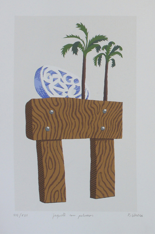 La serie «Juguetes» del artista Patricio Cabrera está compuesta por tres serigrafías (Juguete con palmeras, Juguete con maqueta y Juguete con bolitas) que se presentan en una misma carpeta. Si está interesado en adquirir la carpeta completa, contacte con nosotros en info@galeriarafaelortiz.com